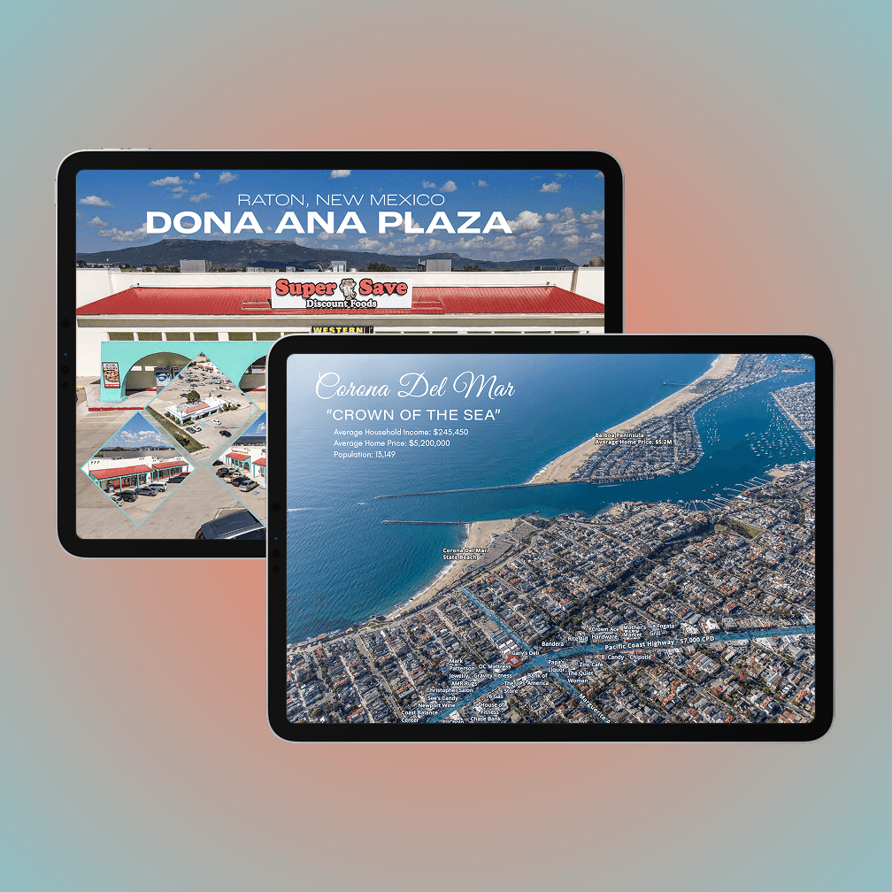 Each offering memorandum was designed to visually align with the financial story being told, with layouts built for skimmability and quick readability. Every booklet included site maps, local area overviews, nearby business highlights, major highway and high-traffic street maps, ingress and egress points, and traffic counts to demonstrate customer flow and property exposure.